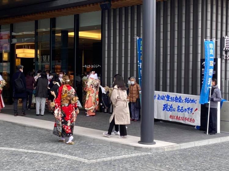 1月11日、奈良市の成人式が行われ、奈良1区市民連合としても初めての宣伝行動を行いました。会場は昨年完成した奈良コンベンションセンターで、感染対策のため午前と午後の2部制で行われました。1区市民連合としても初めての成人式の宣伝行動、しかも初めての場所なので、運営委員が事前に下見も行い、当日は南側4人と北側5人二手に分かれ、主には横断幕とのぼりをもってのスタンディングを行いました。出来立てのリーフレットも用意し、何人かは受け取ってくれました。参加した会員の中には着付けの乱れを見つけて、年の功を活かし、着付けを直してあげたついでにリーフレットを受け取ってくれたというエピソードも。午後の部の開始時には午前の参加者も会場外で交流し、かなりの数の新成人でごった返している状態で、スタンディングしている我々の存在も埋もれてしまいそうな雰囲気でした。