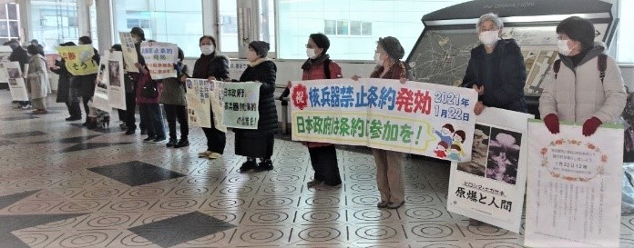 奈良県文化会館前広場に集まった市民は折鶴を散りばめ,「核兵器禁止条約は核兵器を持つことも使うこともゆるさない」と書かれた横断幕の周りに集まりました。被爆された方々や核廃絶を求める世界中の人たちとお祝いと同時に実効されるための行動を起こすことを決意しました。