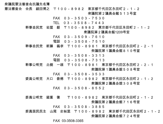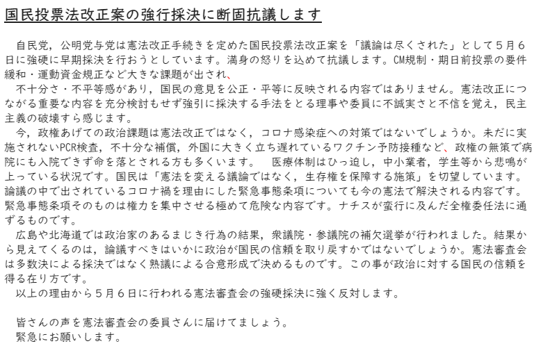 奈良1区市民連合も「改憲阻止」を目的にしています。憲法審査会では国民投票法改正7項目案を強行採決の後,4項目の審議に入ると審査会で主張しています。奈良1区市民連合の会員さんにも抗議のFAX,電話,葉書投函など呼びかけます。