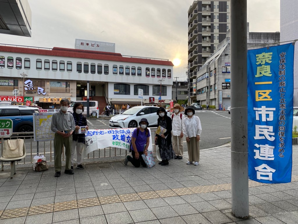 第2回目6月11日17時から18時までは学園前北口でPRトークを行いました。参加者は7名,リーフレットは200枚配布。ミヤンマー支援も訴えました。奈良1区市民連合の訴え「政治をかえよう」とのトークをバスを待つ帰宅者や学生さんが聞き入っていました。