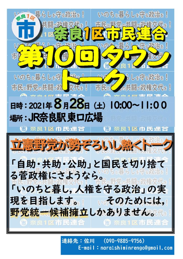 奈良1区市民連合は8月28日(土)10時~11時までJR奈良駅東口前広場で第10回タウントークを行います。
