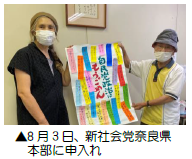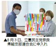 8月2日14 時から日本共産党奈良県委員会委員長細野歩さんに、8月3日13 時半から立憲民主党奈良県総支部連合会代表馬淵澄夫さん宛てに、時半から新社会党委員長森川満さんに申入書を提出しました。タウントークなどで書いていただいた寄書も渡しました。社民党とは8月日に申し入れを予定しています。