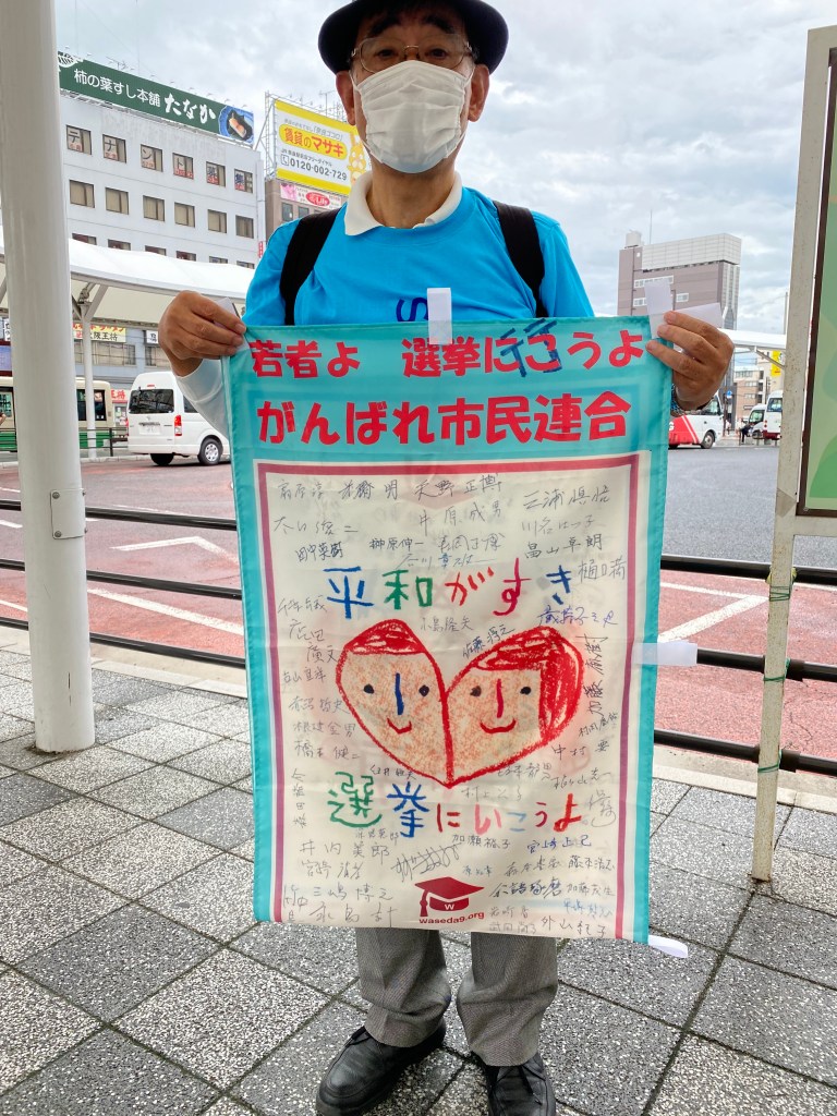 参加者は5人。PRトークに初めて参加された男性が長谷川義史さんの絵(本人に了解済み)が描かれた幟を持参。通学の学生が、バスが来るのを待ちながらしっかりトークを聞いていました。きっと、選挙権ができたら投票に行ってくれると信じています。リーフレットを配布していた時「ご苦労様」と言われたとおじさんはウルウルでした。朝早くから頑張って、いい日でした。