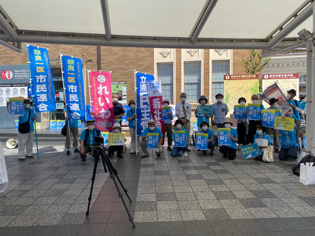 初めて参加された方や通行人の方がTシャツを買ってもらったり、カンパして下さったり、チラシは300枚配布。今回は、社民党さんからの初めての参加もあり、立憲野党さんと参加した市民の間に交流と連帯が出来、充実したタウントークでした。