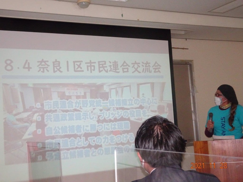 奈良市民連合の共同代表の溝川悠介さんが今回の総選挙の歴史的意義と共闘の大きな成果、課題について語り、「参院選にむけて草の根からたたかう態勢を一刻も早くつくりあげよう」と訴えました。続いて、2区市民連合事務局の松本健さん、中南和市民連合の共同代表の森永雅世さんが1区市民連合 へのエールと決意を述べました。