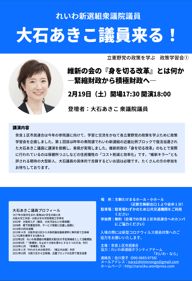 奈良1区市民連合は今年の参院選に向けて、学習と交流をかねて各立憲野党の政策をに学政策ぶため学習会を企画しました。第1回目は昨年の衆院選でれいわ新選組の近畿比例ブロックで復活当選された大石あきこ議員に講演を依頼し、来県が実現しました。維新府政の「身を切る改革」のもとで実際に行われているのは保健所つぶしなどの住民犠牲の「コスト削減と効率化維新」です。”維新キラー”とも評される期待の大型新人、大石議員の具体的で舌鋒するどいお話は必聴です。たくさんの方の参加をお待ちしております。