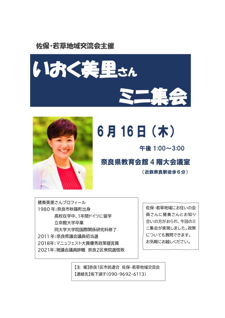 佐保・若草地域にお住まいの会員さんに、いおくさんとお知り合いの方がおられ、今回のミニ集会が実現しました。政策についても質問できます。お気軽にお越しください。