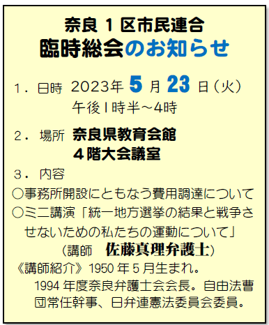 奈良1区市民連合は5月23日に臨時総会を開催します。