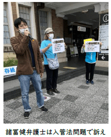諸富健弁護士は、「これまで難民申請中は強制送還されないことになっていたが、今回の改悪によって、3回目以降の申請は強制送還の対象になり、保護すべき外国人を排除し、人権侵害になる。日本の難民認定率はせいぜい1%、諸外国に比べて極端に低く、難民鎖国と言われる。この15年の中で20人近くの方が死亡。