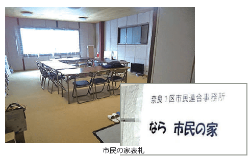 奈良1区市民連合の事務所、「なら 市民の家」が設立されました。場所は近鉄奈良駅か ら北へ160m、東向き北通りに続く花芝町、白鹿荘の向いです。奈良キタマチの入り口に あってすぐ近くに地裁・検察庁・弁護士会館、文化会館・教育会館、県庁・県美術館・興 福寺が連なる絶好のロケーションです。会員の自宅の店舗事務所用に設計された、自宅と は別階段の、道路に面した2階の23畳の広さの部屋です。、床の防音補強や電気工事やエ アコン設置等の改修をおこなって、ゆったりと落ち着いた事務所が立ち上がりました。し かも月々の賃料はナシで、電氣・水道の実費の負担のみで済みます。