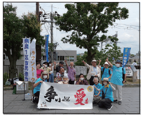 10年前の沖縄慰霊の日、小1の男の子が『へいわってすてきだね』という詩を詠んだ。10年たって与那国島はさらに軍事要塞化している」、中西さん「小6で敗戦。戦争の悲惨さを体験。井上ひさしさん、『過去を軽んじる者は、未来からも軽んじられる』。過去をおろそかにしてはいけない」、浅岡さん「菅原文太さんが残した言葉、政治の役割の一つ、国民を飢えさせない。自給率を高めることこそ食料の安全保障」、八木さん「『沖縄、再び戦場へ』の上映運動は、1区市民連合の草の根運動と方向が全く同じ。平和運動の核分裂を起こそう」、溝川さん「今まさに『ショックドクトリン』の状態。ウクライナ戦争でエネルギー危機をあおって原発回帰。原発産業に儲けさせるため」、石川さん「賃貸でもエネルギーの地産地消は可能。岸田首相の中東訪問は時代に逆行」、最後に坂下事務局長が「国会閉幕、国民犠牲の悪法が多数成立。政治を変えることをあきらめず、総選挙では統一候補を擁立し、国会に送ろう」と訴えました。司会の佐川共同代表から、奈良市が自衛隊に若者名簿を紙媒体で提供している、チェリオが自衛隊とコラボしたジュースを販売しているなど、危険な動きが紹介されました。