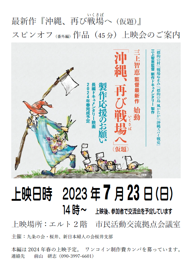 ・飛鳥・紀寺地域交流会:7月27日(木)2時から「沖縄, 再び戦場へ」(仮題)スピンオフ作品上映会