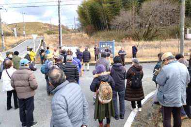 1月21日、「祝園弾薬庫ツアー」が行われ、午前中の雨模様にもかかわらず、地元京都をはじめ近畿各府県から67人が精華町にある祝園分屯地に参集。奈良からも29人が参加しました。祝園分屯地の中には入ることはできませんでしたが、近くの祝園西一丁目集会所で祝園弾薬庫問題の学習会が行われました。