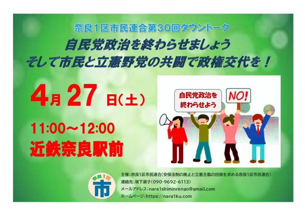 4月27日(土)11時から近鉄奈良駅前でのタウントークへのたくさんの方の参加を呼びかけます。