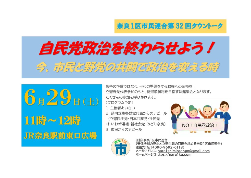 6月29日の第32回タウントークは、県内の立憲野党代表から総選挙に向けての決意表明をいただき、奈良1区での共同候補擁立の動きを大きく前進させていくための「総選挙勝利決起集会」として位置づけて行います。たくさんの参加で、タウントークを成功させ、自民党政治を終わらせ、国民の命、暮らし、平和を守る政権への転換を推進する力にしていきましょう。