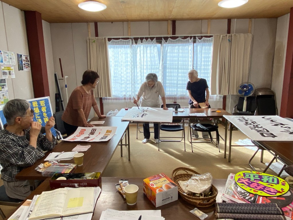 1時半からなら市民の家に集まって自民党政治の事を話しながら参加者で決めた「投票にいこう」「自民党政治を終わらせよう」のメッセージを大きな筆と墨汁を持参した会員が一気に書き上げ完成!よし!