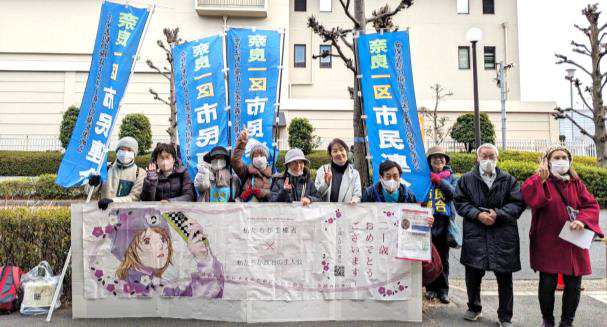 1月13日、恒例の奈良1区市民連合の成人の日宣伝行動に10人が参加。メッセージ入りのティッシュ200個を1時間足らずで配布。「私たちが主権者」のパネルを見て、一緒に写真を撮らせてほしいと2人の若者が駆け寄ってきて、参加者一同明るい気持ちになりました。