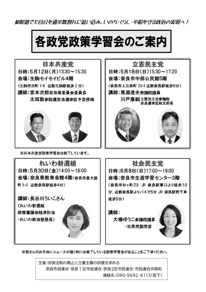 奈良1区市民連合では、各立憲野党から講師をお呼びして、政党の政策を学習する会を行っております。