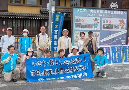 5月31 日JR 奈良駅前、16 名が参加し、約200 枚のチラシを配布。