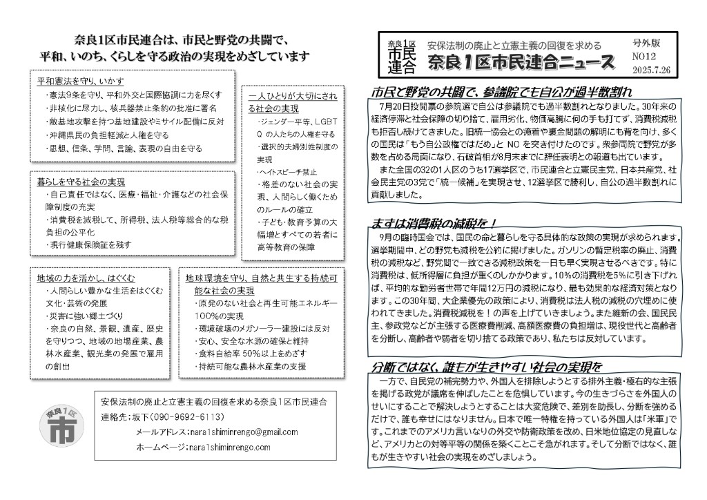 配布した奈良1区市民連合ニュース号外版No12はこちらです。