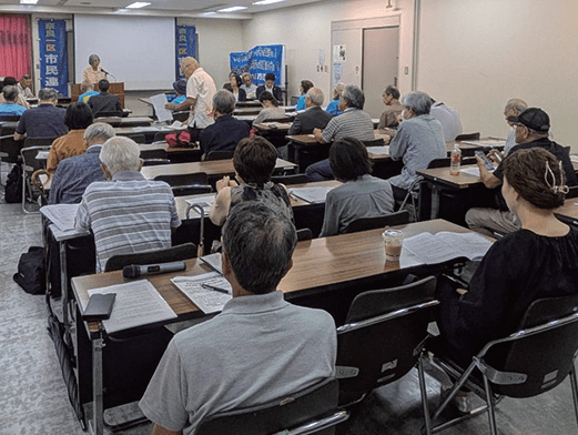 奈良市民の会が諸冨弁護士を講師に迎えて学習交流会を行い48 名が参加。諸富さんは2024 年3月29 日に奈良地方裁判所に提訴した「自衛隊名簿違憲訴訟」を紹介しながら自衛隊に対し奈良市が個人情報を提供している事に対して「個人4情報を原則非公開とした主旨に反し個人情報保護法違反」と述べました。この背景には隊員不足もあり、「2400 校の小学校に『子ども版防衛白書』送付」「小学校6年社会教科書QR コードに防衛省・自衛隊キッズサイト掲載」「子ども食堂で勧誘」「高校卒業予定者に職業紹介」など勧誘の状況を報告。