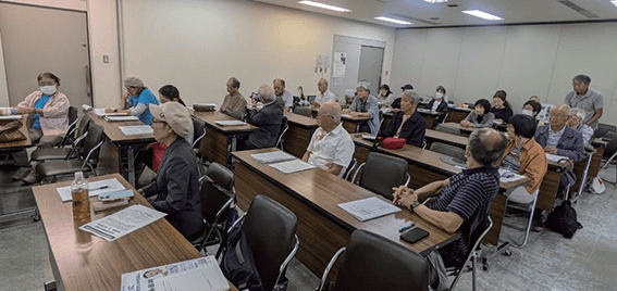 *9月20 日 テーマ:「介護について」 講師:やくしの里 奥谷弘之さん:介護保険制度は社会全体で介護を支える事を目的に2000 年に創設。国と地方の公費、利用者の自己負担で賄っている制度。保険料は当初は2911 円と安く歓迎されたが3年に1度の見なおしで改悪、現在は6014 円と負担。サービスも低下しているのが実態。今では「保険あって介護なし」という実態。「全世代型社会保障改革」の名のもとに世代間の対立を煽り社会保障の削減を推進している」との説明に参加者には怒りの声が。「介護の実態が良く分った」と好評。
