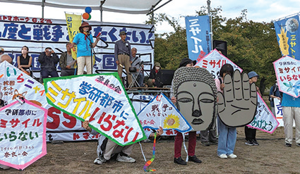 10 月19 日朝、最大の心配事だった雨も前夜来の雨も上がり、けいはんな記念公園芝生広場には爽やかな空気が流れていた。人々が次々詰めかけ、芝生広場にシートを敷いて座る中、エイサー隊の太鼓の音とともにこの日の幕は開いた。女性2人の詩の朗読やピアノの弾き語りやラップや島唄の三線、ロックと、個性と魂が響く演奏が続き、川口真由美さんの豊かな声が響き渡る頃には、会場に続々と人が詰めかけ、2700 人に達する中で、全国リレートークを迎えていた。石垣島、大分、熊本、呉・岩国、愛知、静岡、神奈川、そして関西=祝園、京丹後経ガ岬、舞鶴、饗庭野、神戸港、奈良、大阪、精華町、最後に沖縄・具志堅さんのまとめと、各地が直面する戦争準備の現実とそれに対峙する運動の切実さと気迫と不屈さを、その話し方、用意されたパネルや横断幕やパフォーマンスによって会場全体を引き込むように訴えた。