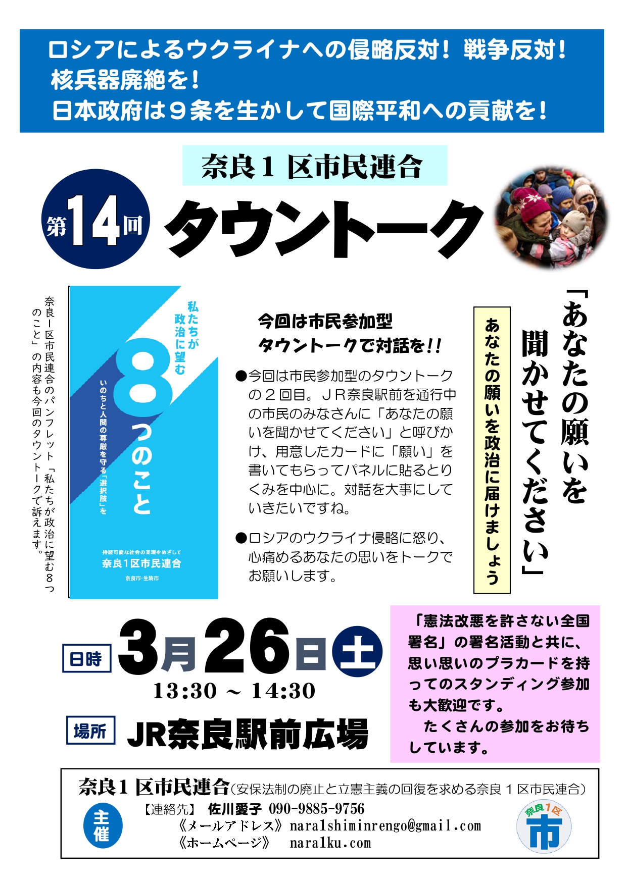 ロシアによるウクライナへの侵略反対!戦争反対! 核兵器廃絶を! 憲法変えてる場合じゃない! 日本政府は9条を生続きを読む “奈良1区市民連合 第14回タウントーク”