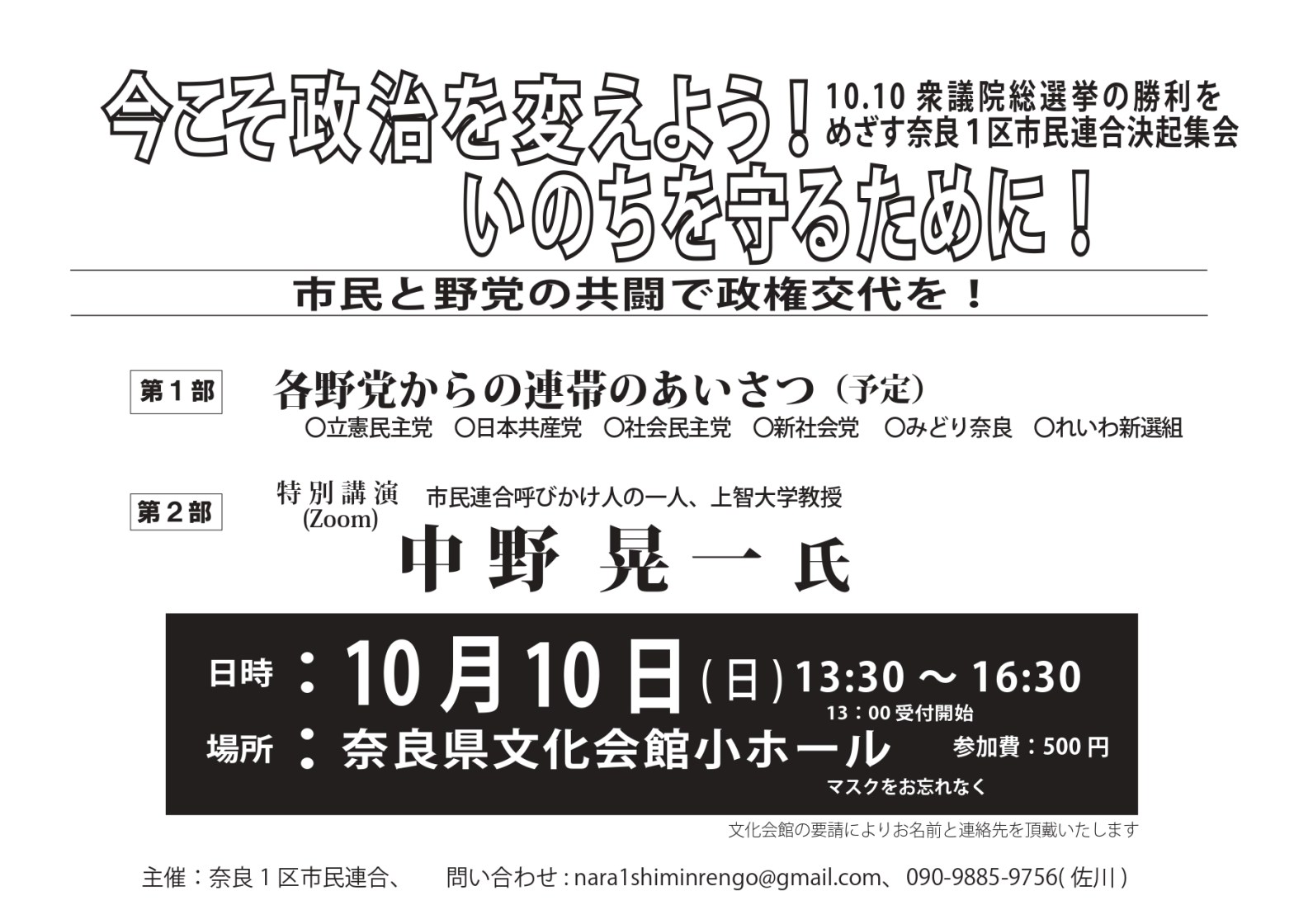 今こそ政治を変えよう!いのちを守るために! 市民と野党の共闘で政権交代を! 10月10日に衆議院総選挙の勝利を続きを読む “10月10日13:30~16:30 衆議院総選挙の勝利をめざす奈良1区市民連合決起集会”