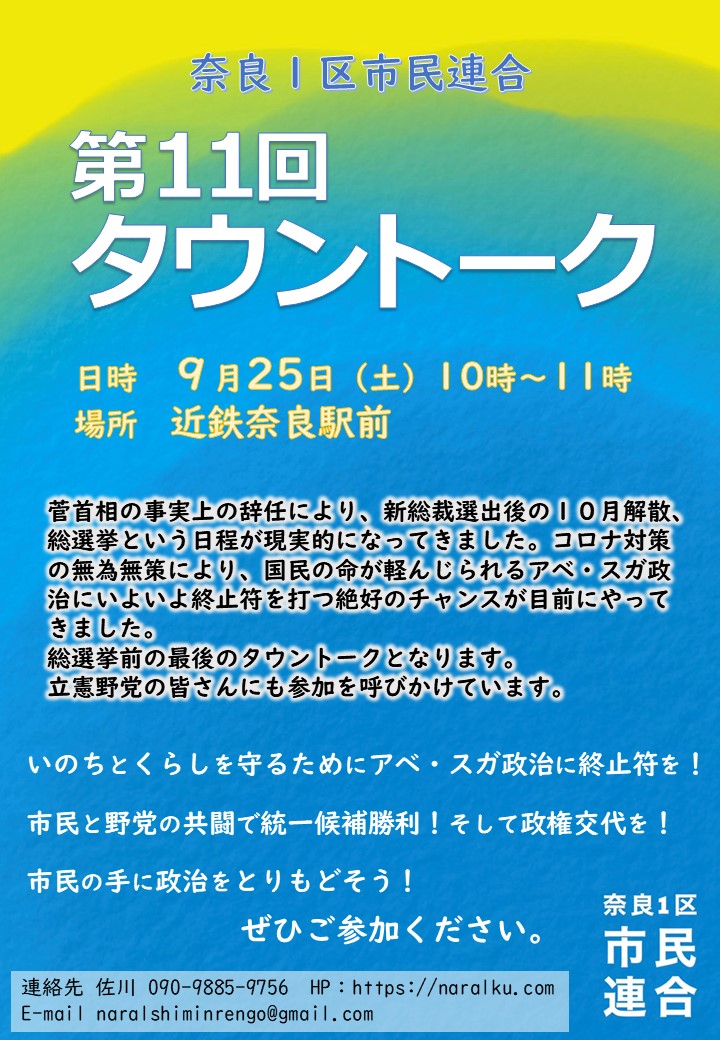 奈良1区市民連合は9月25日(土)10時~11時まで近鉄奈良駅前で第11回タウントークを行います。 菅首相の事続きを読む “9月25日(土)10時~11時 第11回タウントーク 近鉄奈良駅前”