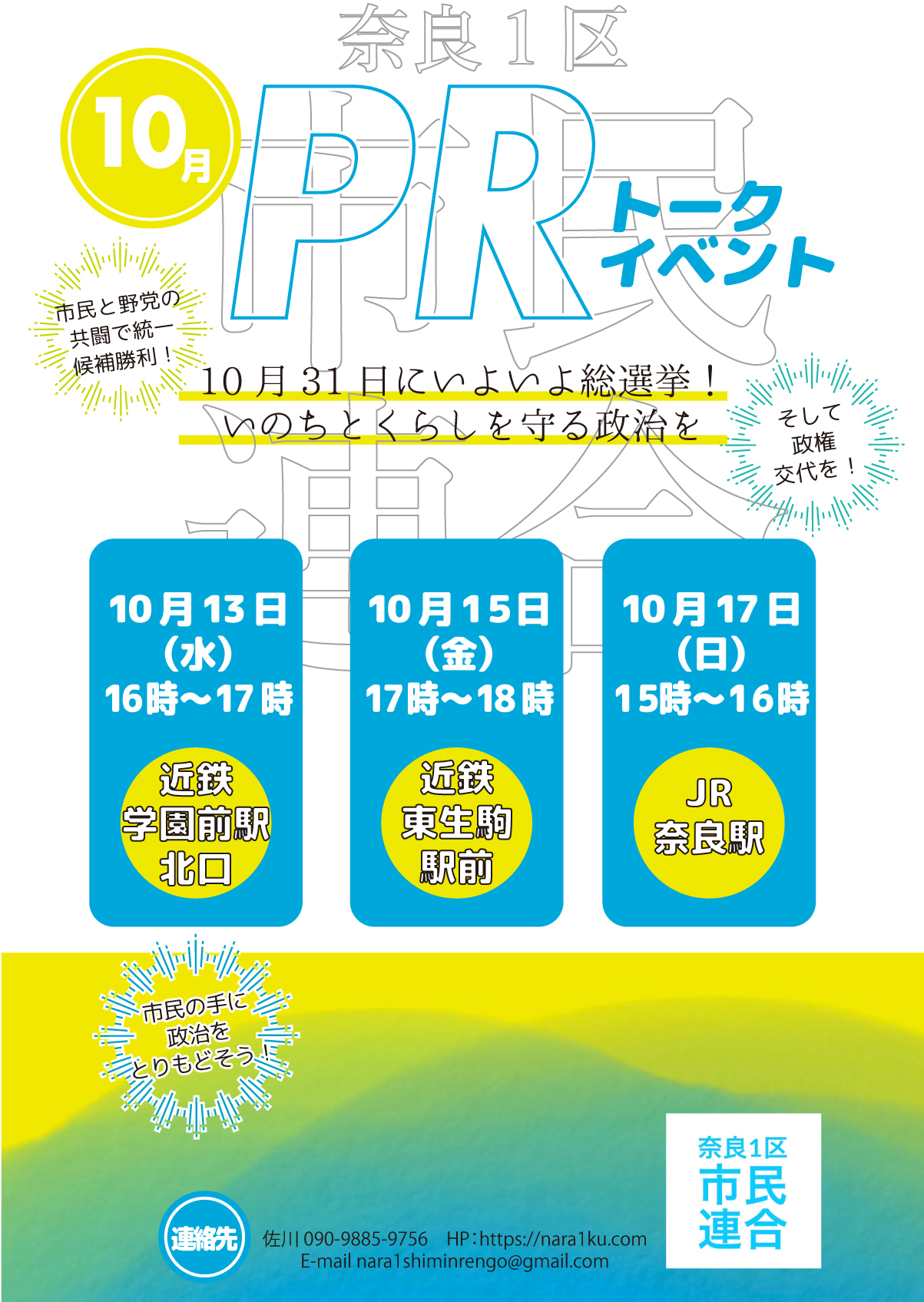 いよいよ総選挙が目前に迫ってきました。 奈良1区市民連合では、公示まで、PRトークを積極的に行います。 ぜひ、続きを読む “10月のPRトーク”