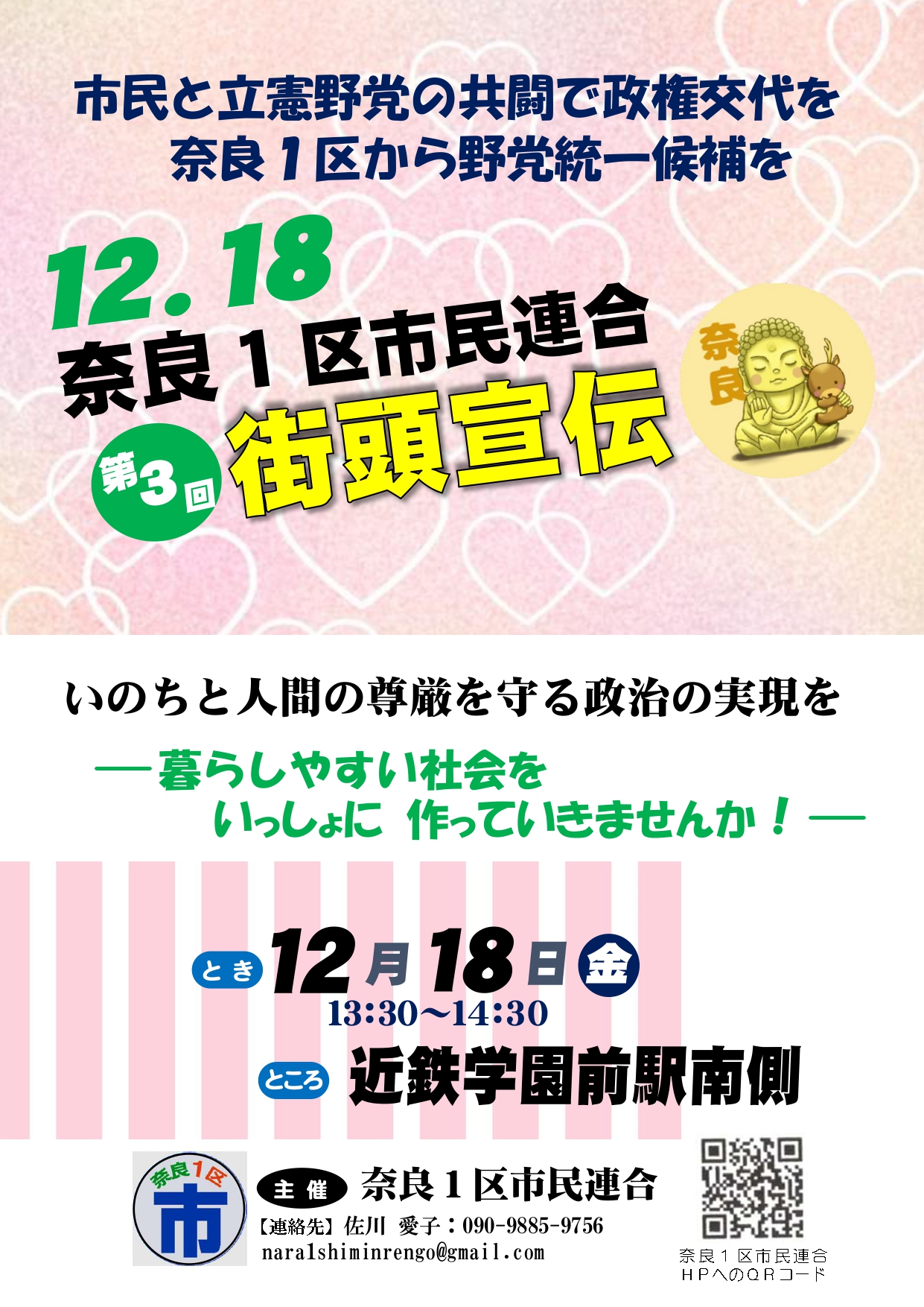 日時:2020年12月18日(金) 13:30~14:30 場所:近鉄学園前駅 南側 市民と立憲続きを読む “2020年12月18日(金)第3回街頭宣伝”