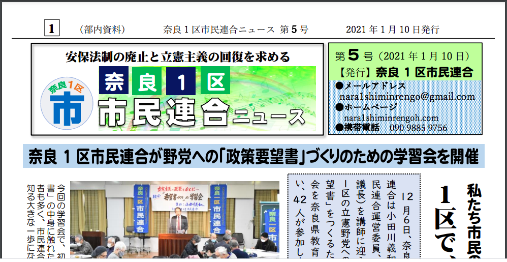 2021年1月10日発行 奈良1区市民連合が野党への「政策要望書」づくりのための学習会を開催 私たち市民の願い続きを読む “奈良1区発行ニュース5号”