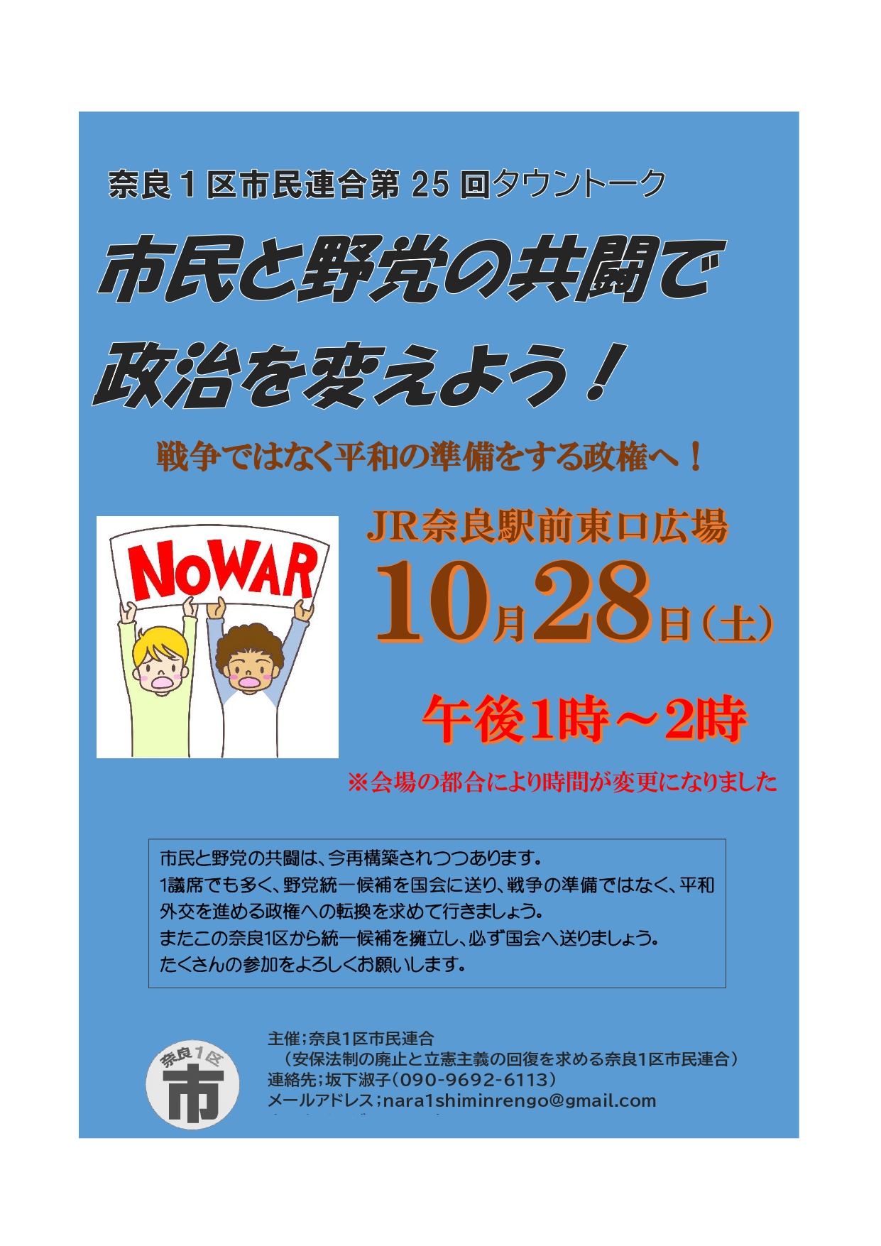 奈良1区市民連合 第26回タウントーク 11月25日(土)11時~12時 JR奈良駅前東口広場にて 市民と野党続きを読む “第26回タウントーク”