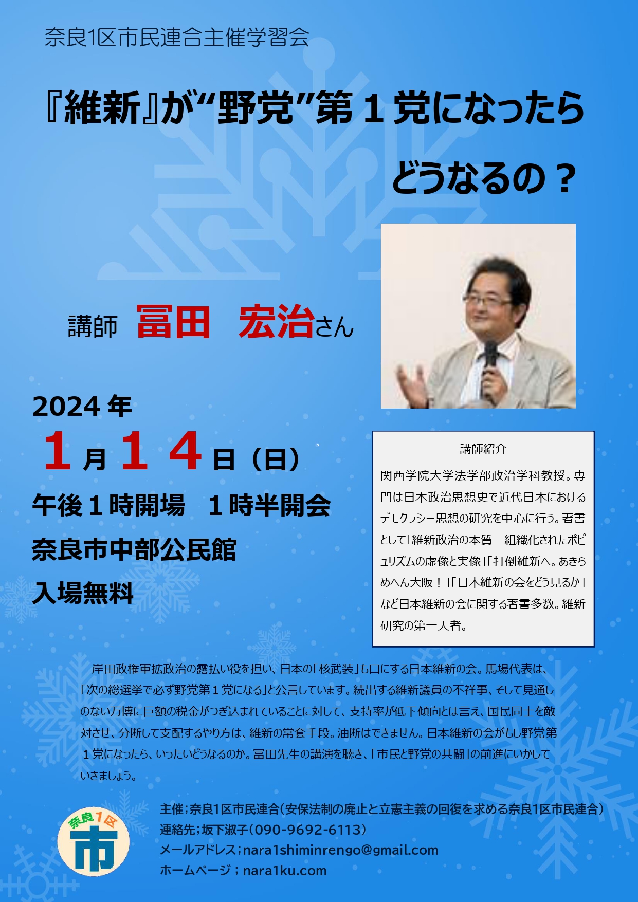 奈良1区市民連合主催学習会 『維新』が“野党”第1党になったらどうなるの?講師 冨田 宏治さん2024年1月1続きを読む “「『維新』が“野党”第1党になったらどうなるの?」冨田 宏治さんの講演を公開”