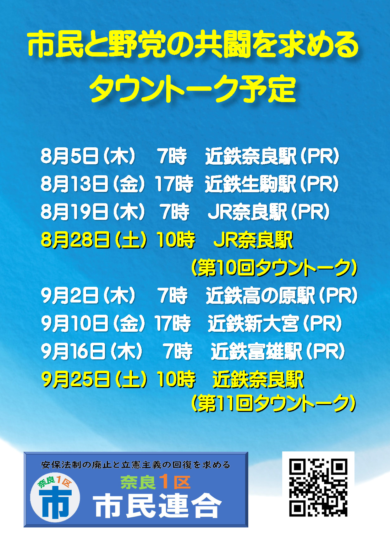8月と9月の市民と野党の共闘を求めるタウントーク予定