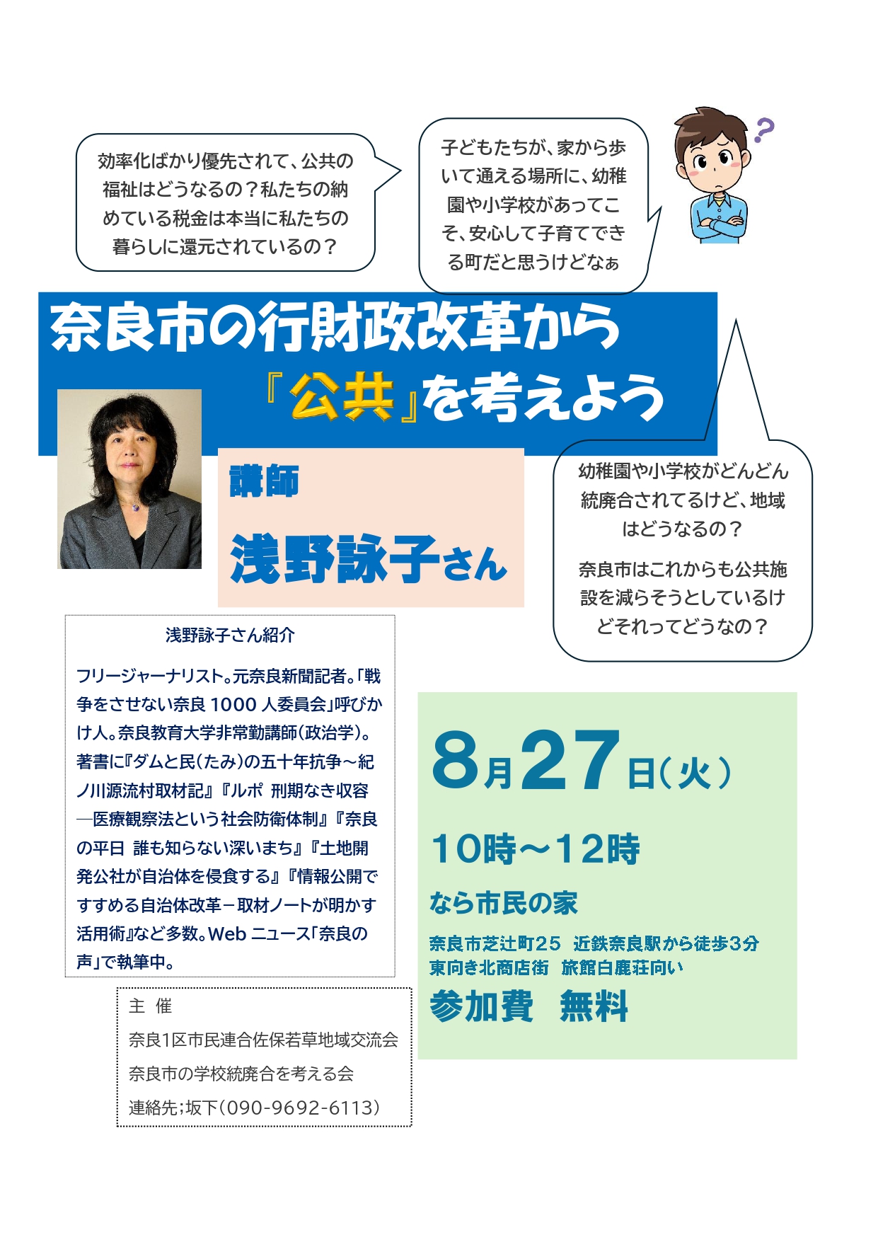 奈良市の行財政改革から『公共』を考えよう 浅野詠子さん講演会 と き 8月27日(火)10時~12時 ところ なら市民の家 奈良市芝辻町25 近鉄奈良駅から徒歩3分続きを読む “奈良市の行財政改革から『公共』を考えよう 浅野詠子さん講演会 ”